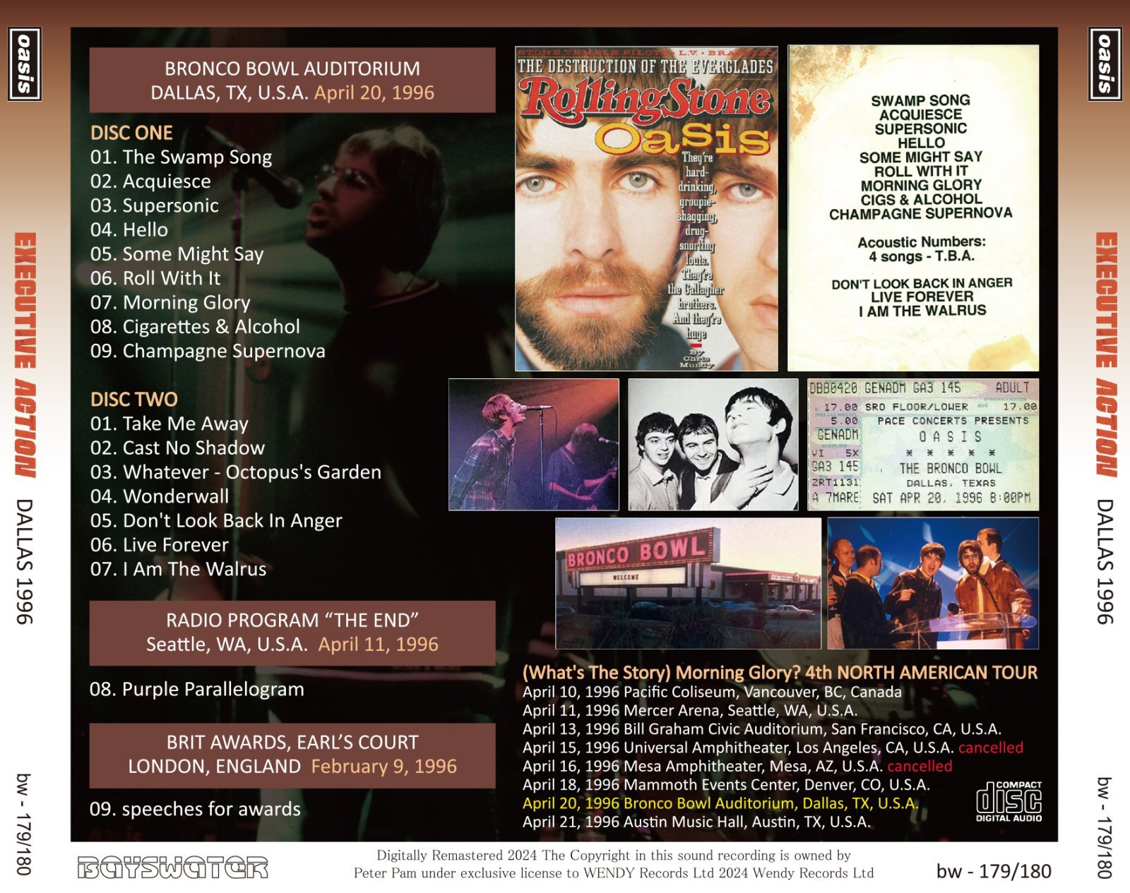 モーニング・グローリーに伴うツアーの中で、4度目の短期アメリカン・ツアーより、1996年4月20日ダラス公演を高音質で完全収録。このツアーは当初8公演が予定されていたが、ノエルがインフルエンザに罹患した事により2公演がキャンセルされ、結果的にわずか6公演のみとなった。この後イギリスに戻り、あの歴史的なメインロード公演を控えている。本作はその直前一週間前のコンサートである。日替わりのアコースティック・セットでは、通算7回しかステージで演奏されていない珍しい「Take Me Away」が披露されている。この日を最後にオアシスではこの曲は演奏されていない。また、イントロなしのアカペラで始める「Cast No Shadow」も萌えるところ。