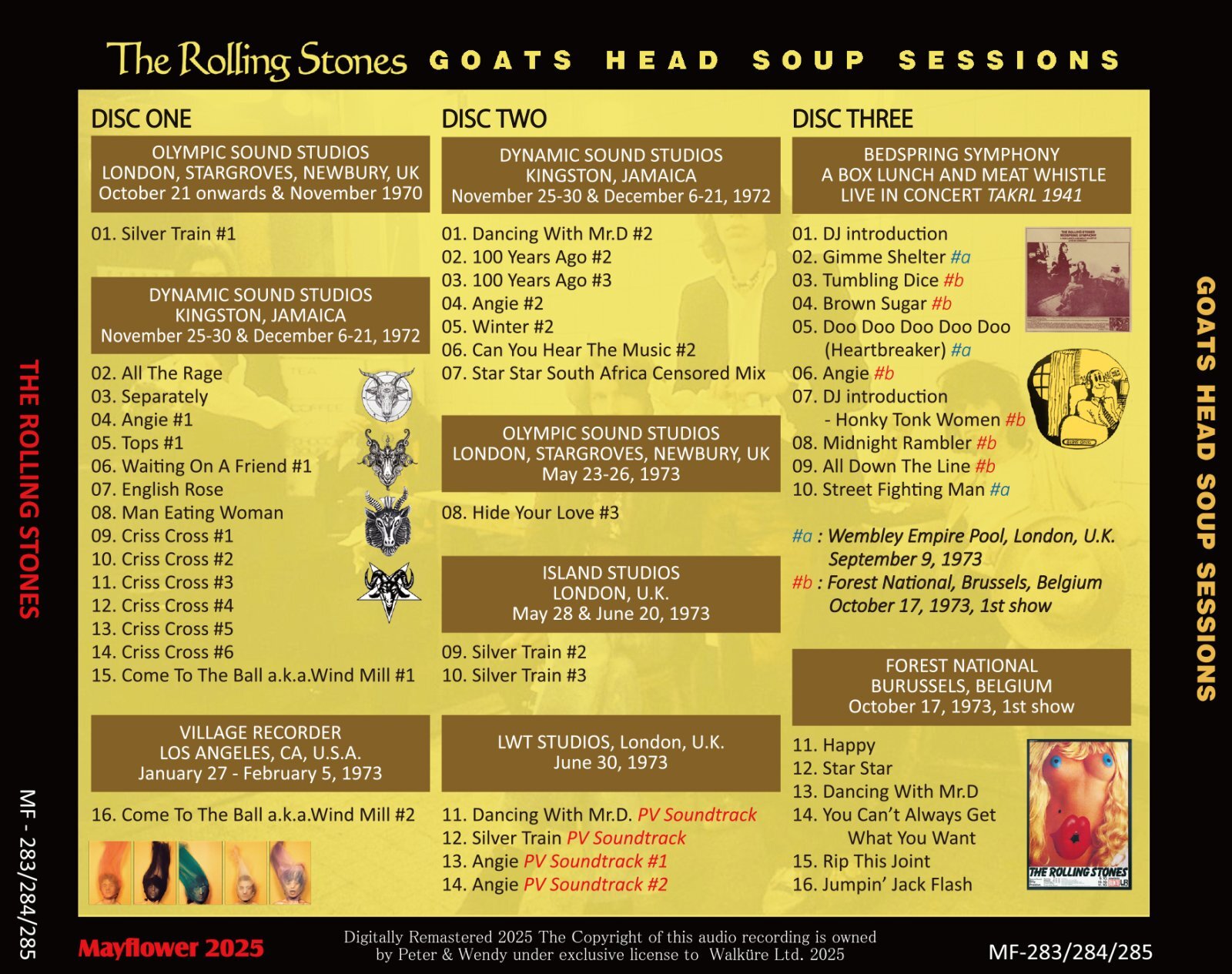 近年発掘された音源を含め『山羊の頭のスープ』のセッション音源を網羅。ディスク3は『BEDSPRING SYMPHONY』を収録。DJを含む名盤アナログ復刻で、ならではの迫力あるミックスで収録している。美しいピクチャー・ディスク仕様の永久保存がっちりプレス盤。