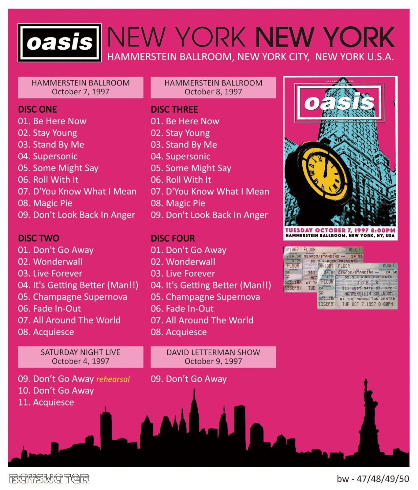 1997年9月に欧州ツアーを終えたオアシスは10月初頭に渡米する。目的はツアーではなく、リリースされたばかりのアルバム『BE HERE NOW』のプロモーションであった。この渡米では、わずか2度のテレビ出演と、ニューヨークのハマーステイン・ボールルームでの2公演のみというスケジュールであった。本作はそれら全てを収録したものである。プロモーションという事もあり「Don't Go Away」はこの時が初演。10月7日は非常に優れた高音質オーディエンス音源であり、10月8日は完璧なサウンドボード音源である。