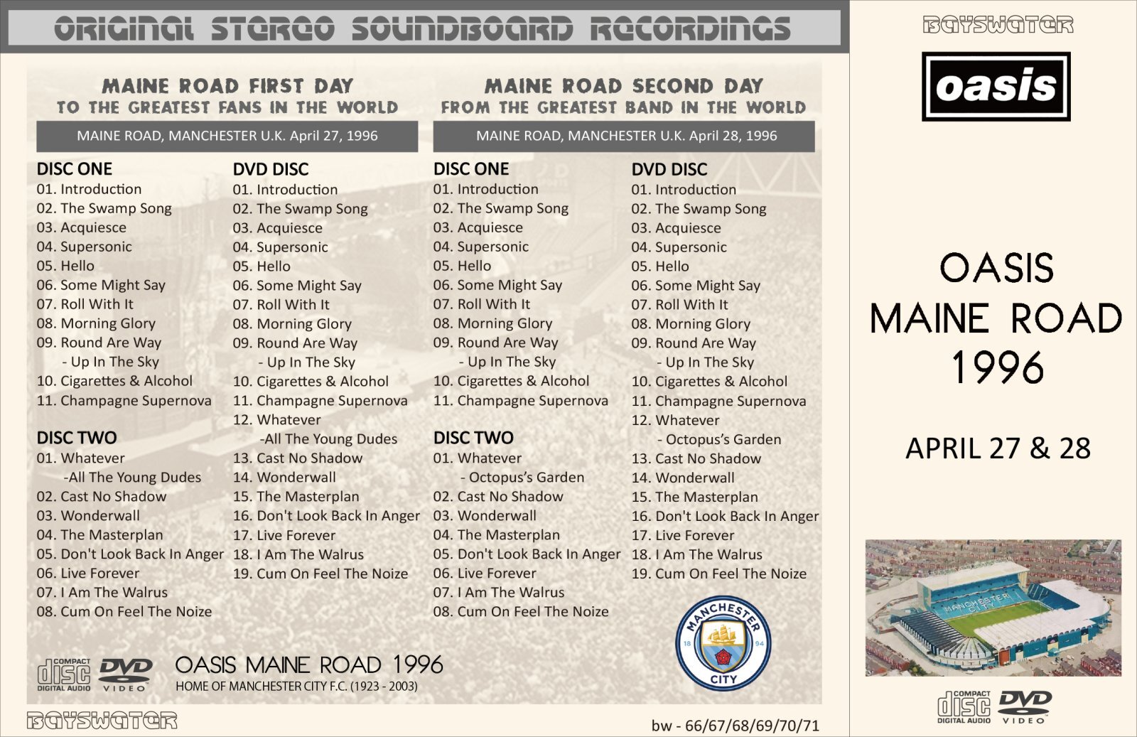 あらゆる意味でオアシス・ファンにとって大切な宝物となっている、このメインロードでの二日間を、サウンドボードとプロショット映像の両方で完全収録したのが本作である。既発盤では欠落のあった初日「Wonderwall」冒頭部分は当日のオーディエンス音源で補完されており、メインロード初日を完全収録したものは本作が初である(これまで二日目の音で補完したフェイク盤はあった)。