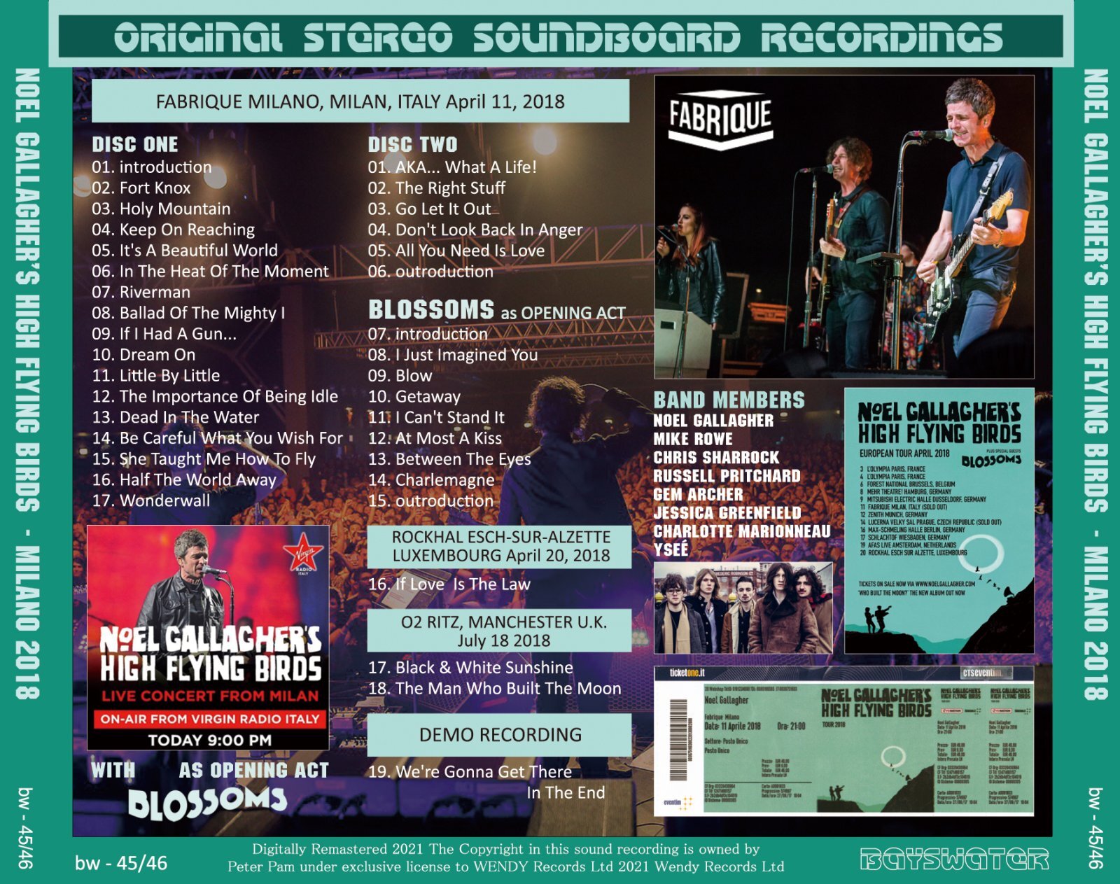 また本編とは別に、当日の前座を務めたBLOSSOMSのステージを、こちらはオーディエンス音源で完全収録している。さらにボーナストラックとして同ツアーより3曲を収録。この3曲はミラノでは演奏されなかったもので、いずれもアルバム『Who Builte The Moon?』の収録曲である。美しいピクチャー・ディスク仕様の永久保存がっちりプレス盤。
