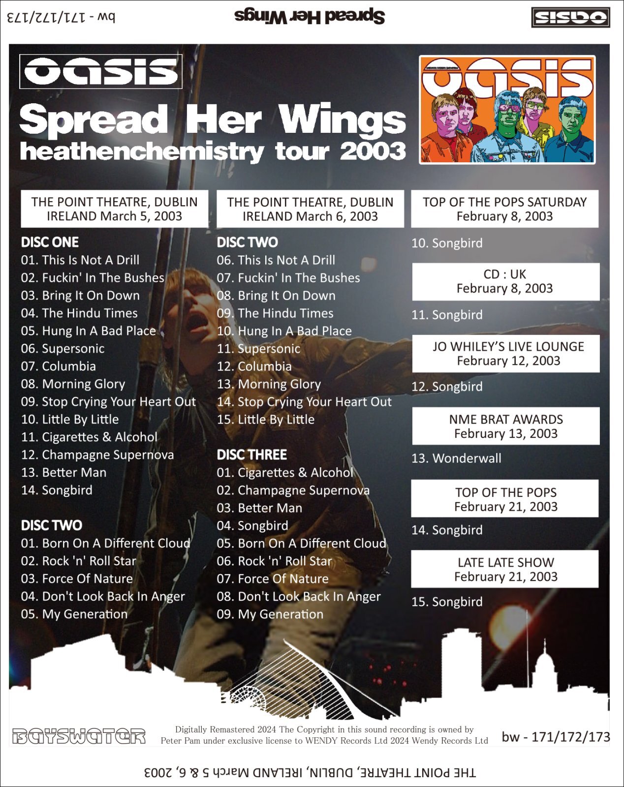 Heathen Chemistry Tourといえばほぼ2002年を通して行なわれた印象が強く、実際にその通りなのだが、2003年に入っても僅か6公演のみながらアイルランドとドイツで行なわれている。そして本作は2003年3月5日と6日、アイルランドはダブリン連続公演を高音質で両公演完全収録している。ボーナストラックでは、この時期に単発で出演したテレビ、ラジオなどの新曲プロモーションで出演時の音源を収録している。美しいピクチャー・ディスク仕様の永久保存がっちりプレス盤。